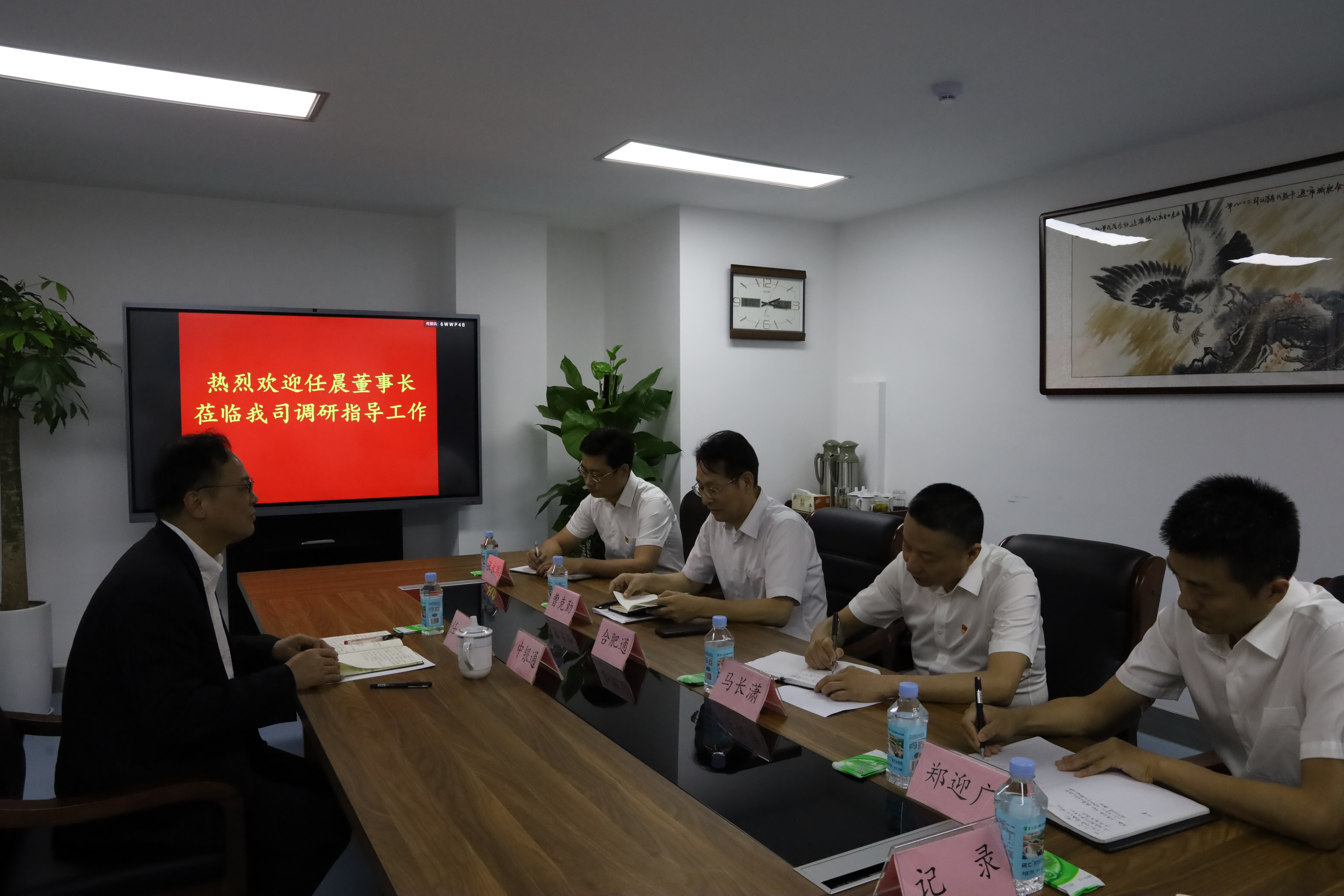 9月17日下午,中银通支付商务有限公司董事长任晨莅临tyc5997太阳集团首页调研指导工作。公司总经理曹克勤、支部书记、监事长马长潇、副总经理张永瑞、郑迎广参加调研。