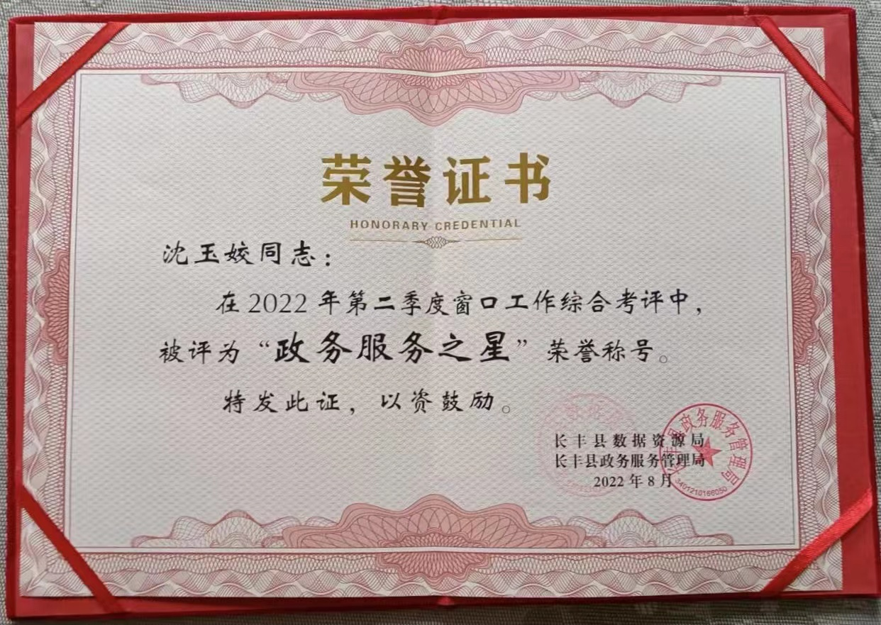 我司长丰县政务服务中心服务窗口工作人员沈玉姣,以优质的服务获得了“政务服务之星”荣誉称号。她业务精湛、服务热情、爱岗敬业。在平时的工作中,她时时刻刻想用户之所想,急用户之所急,竭诚为用户提供热情优质的服务,因此获得过用户的来电、来信、锦旗表扬和感谢。