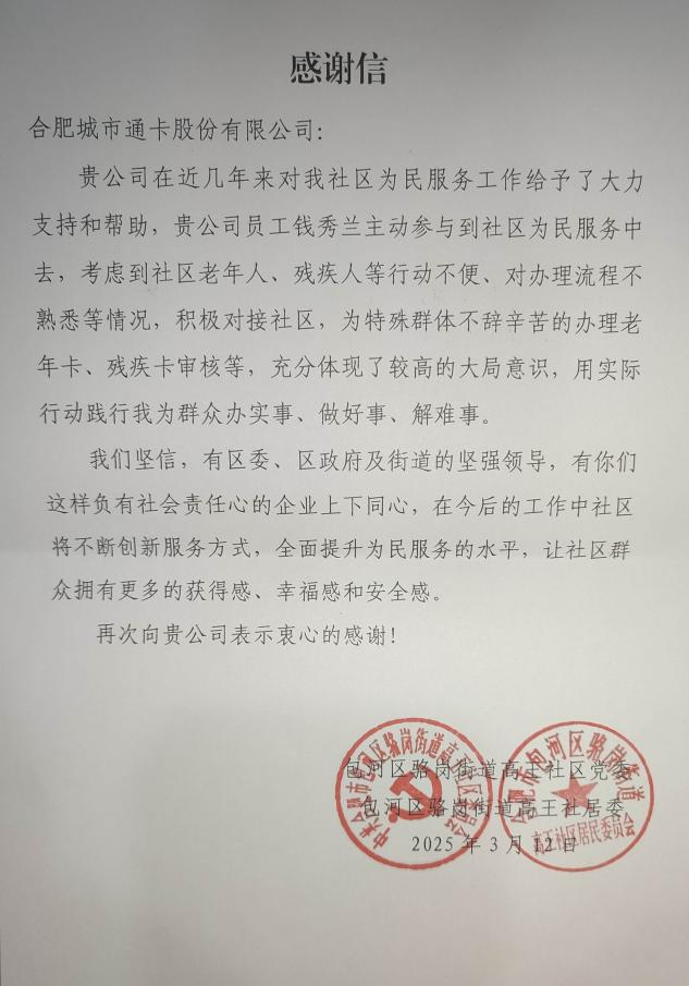 3月14日下午,公司瑶海客服分中心收到包河区骆岗街道高王社区党委和社居委送来的一面“服务热情效率高、便民利民暖万家”的锦旗和感谢信,对客服中心工作人员钱秀兰积极主动参与社区为民服务,为特殊群体办理敬老卡、残疾人卡审核等服务的举动表示感谢。