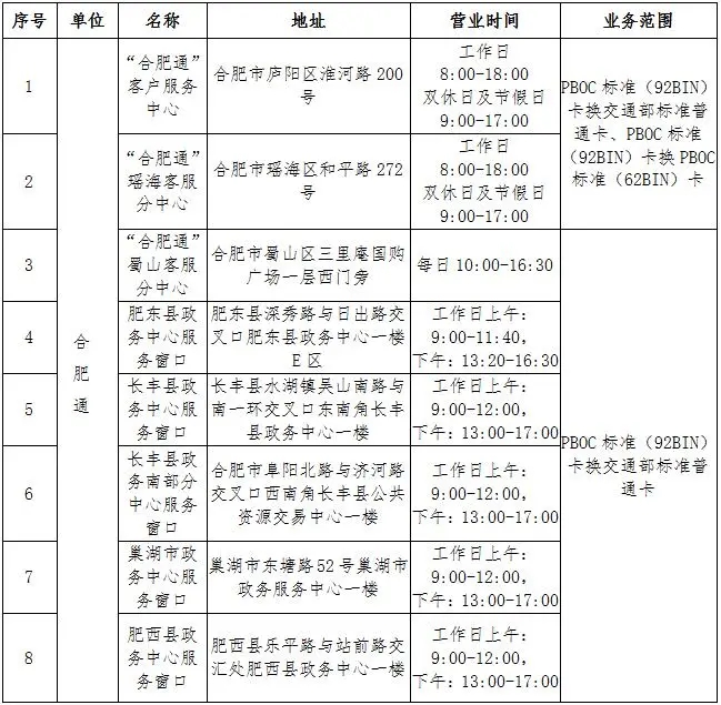 1、为有合肥市域外公交场景使用需求的用户,提供指定网点人工免费换为交通部标准普通卡服务。