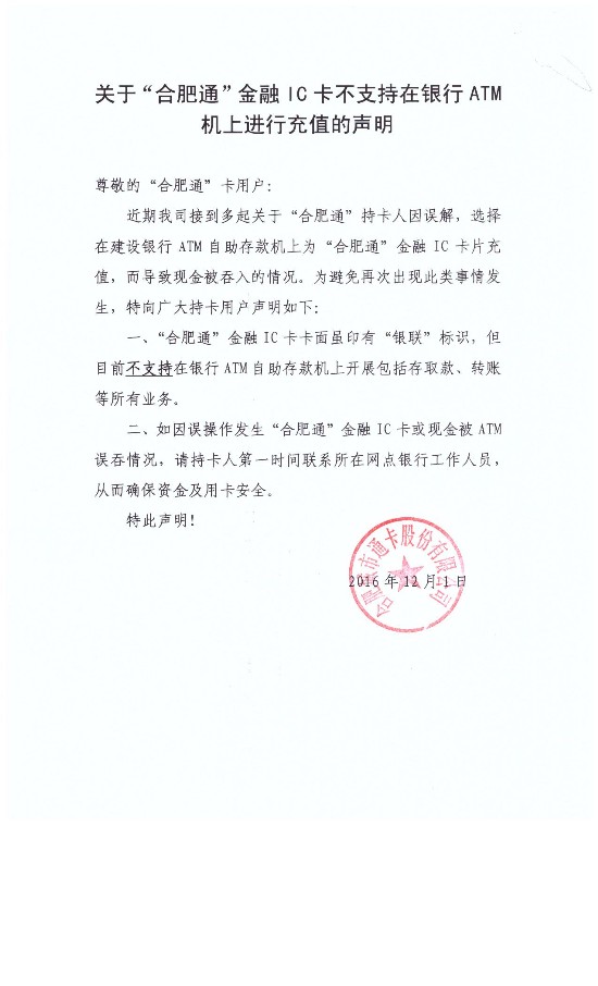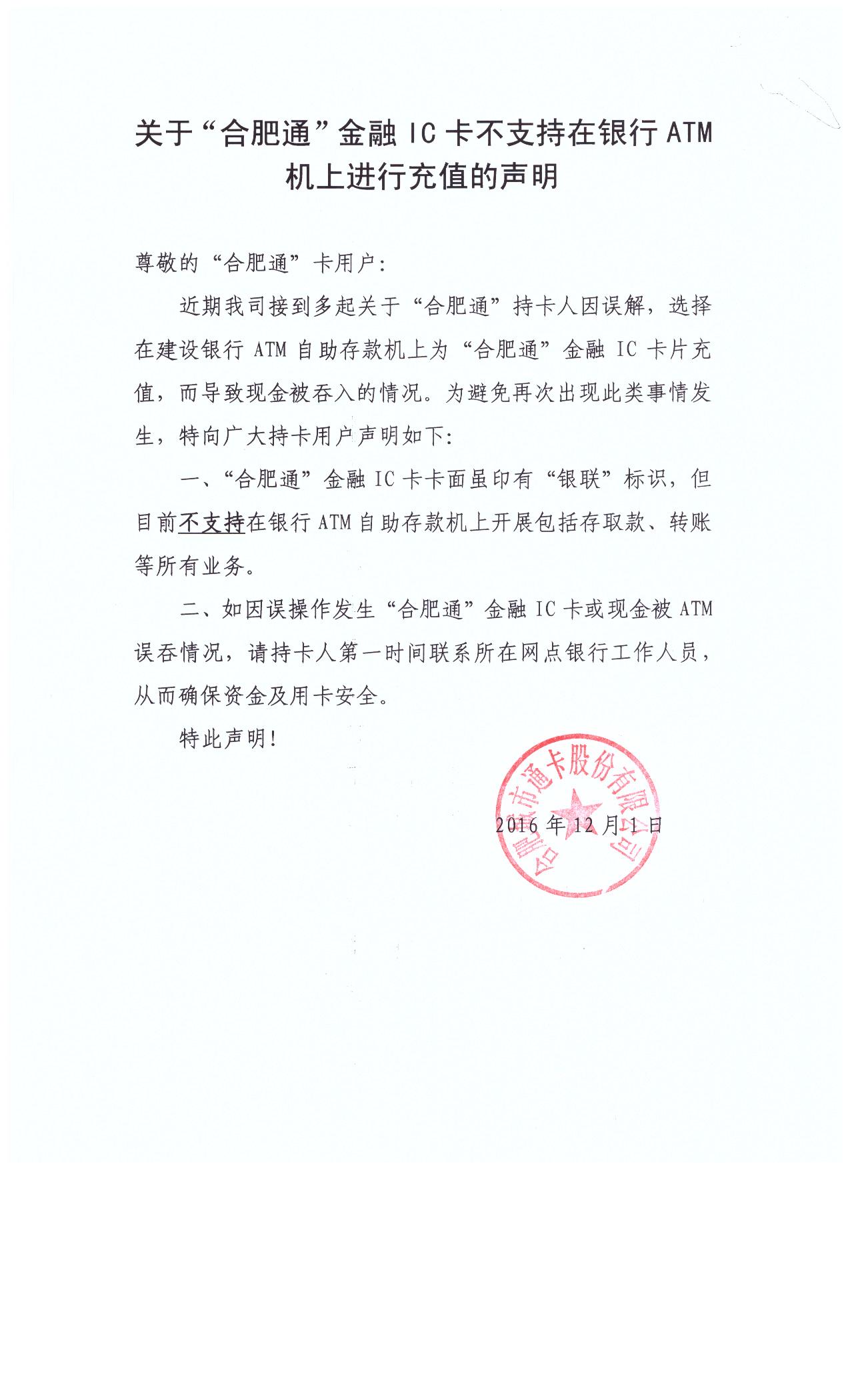 关于“tyc5997太阳集团首页”金融IC卡不支持在银行ATM机上进行充值的声明