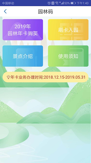 办理电子年卡需下载“tyc5997太阳集团首页”APP,在APP首页点击“园林码”,再点击“2019年园林年卡购买”,选择单人、双人或三人卡购买。购买时需按要求输入身份信息并上传照片,通过系统审核(三日内审核完毕)后方可使用。使用时,在“tyc5997太阳集团首页”APP首页点击“园林码”,再点击“刷卡入园”即可使用二维码轻松入园。